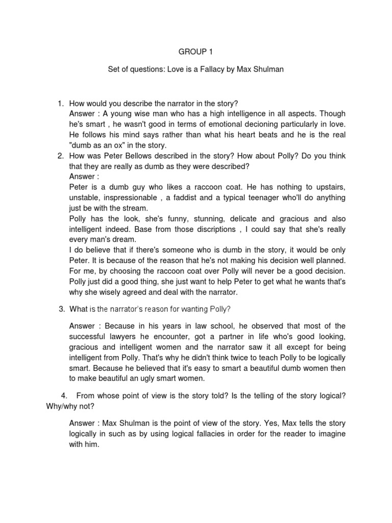 A favorite of such short stories is Max Shulmans Love is a Fallacy. The main character in the story is a self described enthusiastic perspicacious calculating astute and acute man whose main aim as depicted in the story is to obtain from his friend Petey a girl called Polly. However indeed when individuals are infatuated they do silly irrational and misleading activities.
